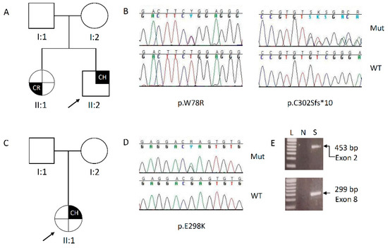 (A–C): Pedigree of the families under study. The arrow indicates the proband; (B–D): elechropherograms showing the pathogenic variants identified. For each case, on the top the mutated sequence, on the bottom the wild type; CH: chronic hypoparathyroidism; CR: cutaneous rush; L = ladder; N = negative PCR reaction; S = sample.