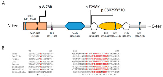 The p.(Trp78Arg) variant lies in the CARD/HSR domain, while the other two, close to one of each other, both fall in the PHD1 domain (Figure 3A). Homolog sequence multialignment showed that the W78 and the E298 are conserved in fishes, while the sequence across and after the C302 residue is conserved even in insects (Figure 3B), thus strongly suggesting the importance of this aminoacidic sequence for the protein function.
