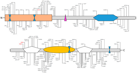 Deleterious (pathogenic and likely pathogenic) variants and variants of unknown significance (VUS) identified in the AIRE gene and their locations within the different domains of the protein. Deleterious variants are shown above, while VUS is below the protein structure. Data have been downloaded from ClinVar (https://www.ncbi.nlm.nih.gov/clinvar/?term=aire[gene]). Please note that large genomic deletions, benign, and synonymous variants are not shown.