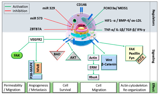 CD146 can interact with diverse ligands that mediate and alter endothelial functions (Figure 1). In fact, CD146 activation induces the phosphorylation of p125FAK and paxillin along with p59fyn recruitment in cultured endothelial cells, leading to actin cytoskeleton reorganization and activation of transcription factors that modulate cell migration and survival [47]. Moreover, the intracellular domain of CD146 interacts physically with actin linked proteins of the ezrin-radixin-moesin (ERM) family, bringing them to the level of membrane protrusions. This CD146-mediated formation of microvilli like extensions will then allow the activation of RhoA by sequestering Rho guanine nucleotide dissociation inhibitory factor 1 (RhoGDI1), leading to an increase in cell motility. In addition, the stimulation of melanoma cells with Wnt5a induces CD146 redistribution within polarized structures known as W-RAMP (Wnt5a-mediated receptor-actin-myosin polarity), leading to membrane retraction and cell migration in a RhoA-mediated mechanism [48]. Finally, a defect in CD146 expression is associated with an upregulation of the canonical Wnt pathway and a downregulation of the non-canonical pathway [49].