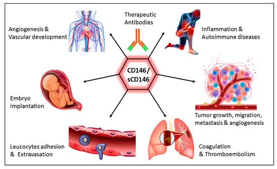 The fundamental role of cell adhesion molecules in mediating various biological processes as angiogenesis has been well-documented. CD146, an adhesion molecule of the immunoglobulin superfamily, and its soluble form, constitute major players in both physiological and pathological angiogenesis. A growing body of evidence shows soluble CD146 to be significantly elevated in the serum or interstitial fluid of patients with pathologies related to deregulated angiogenesis, as autoimmune diseases, obstetric and ocular pathologies, and cancers. To block the undesirable effects of this molecule, therapeutic antibodies have been developed. Herein, we review the multifaceted functions of CD146 in physiological and pathological angiogenesis and summarize the interest of using monoclonal antibodies for therapeutic purposes.