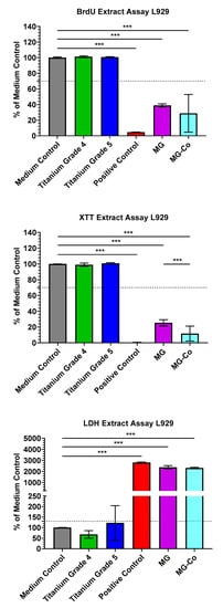 Cytocompatibility of both treated and untreated magnesium variants. Cytotoxicity was measured by LDH-assay; viability was measured by sodium 3,3′-[1(phenylamino)carbonyl]-3,4-tetrazolium]-3is(4-methoxy-6-nitro) benzene sulfonic acid hydrate (XTT) assay, and proliferation was measured by bromodeoxyuridine (BrdU) assay. Means with error bars indicating standard deviations. The dotted line indicates thresholds that should not be exceeded (lactate dehydrogenase (LDH)) or fall below (XTT; BrdU) (*** p < 0.001).