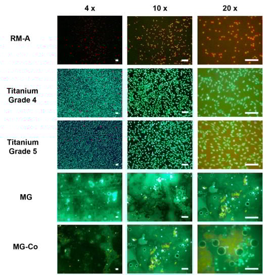 Live–dead staining of the test samples. Pure magnesium membrane = MG, coated magnesium membrane = MG-Co. Green: vital cells; red: dead cells (scale bars = 100 µm).