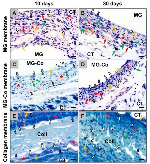 Exemplary histological images of the tissue reactions to the three different membrane types, i.e., the pure magnesium membrane (MG) (A,B), the coated magnesium membrane (MG-Co) (C,D) and the collagen membrane (Coll) (E,F), within the subcutaneous connective tissue (CT) at day 10 and 30 post implantation. Red asterisks = reactive cell multilayer at the material surfaces, white arrows = macrophages, yellow arrows = eosinophils, purple arrows = fibroblasts, green arrows = mast cells, red arrows = blood vessels (Giemsa staining, 400× magnification, scale bars = 10 µm).