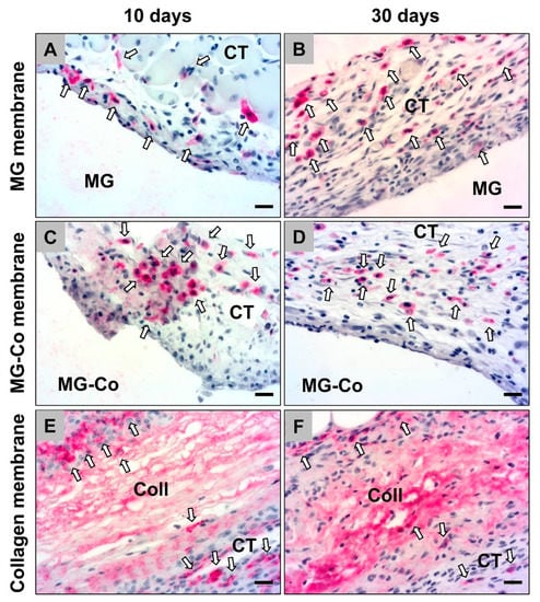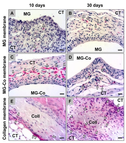 Exemplary histological images of pro-inflammatory (NF-κB-positive) macrophages (white arrows) within the implant beds of the different membranes, i.e., the pure magnesium membrane (MG) (A,B), the coated magnesium membrane (MG-Co) (C,D) and the collagen membrane (Coll) (E,F). CT = connective tissue (NF-κB immunostainings, 400× magnification, scale bars = 10 µm).