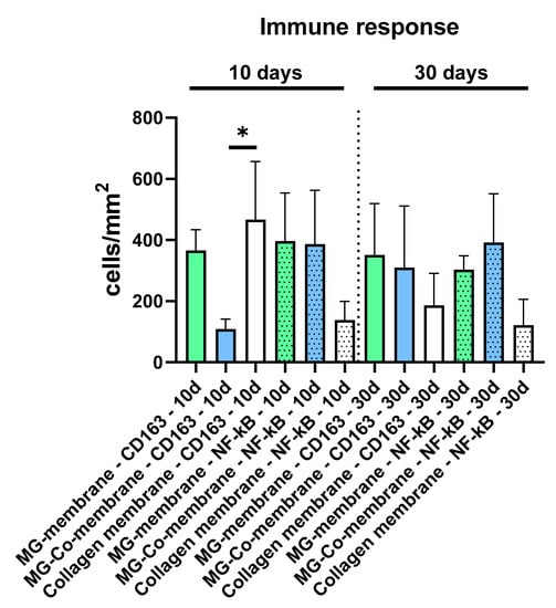 The histopathological analysis of the occurrence of pro-inflammatory NF-κB-positive cells showed that comparable numbers of this macrophage subtype were observable in the study groups of the pure MG membrane and the collagen membrane at day 10 post implantation, while lower numbers were detectable in the group of the coated MG membrane were detectable at this study time point (Figure 5).