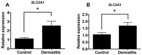 The expression levels of glucose transporters are increased from dermatitis patients. (A) Relative expression levels of Glut1 (SLC2a1) in normal controls (n = 38) and dermatitis patients (n = 34). (B) Relative expression levels of Glut3 (SLC2a3) in normal controls (n = 82) and dermatitis patients (n = 83) Data shown are mean ± SEM and analyzed by Student’s t-test (* p < 0.05).
