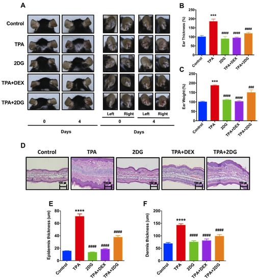 Skin inflammation was induced in the mouse ear (n = 6) by topical application of 12-o-tetradecanoylphorbol-13-acetate (TPA). A total of 20 µL of TPA solution (50 µg/mL of TPA in 1%DMSO/99% acetone) was applied to the anterior and posterior surfaces of the mice ears every day for 4 days. Dexamethasone (0.4 mg/kg) and 2DG (50 mg/kg) were topically administrated to mice ears 1h after TPA treatment and the control group was the treated vehicle (1% DMSO/99% acetone). To determine inflammation, ear thicknesses were measured prior to each TPA application using a digital caliper (Mitutoyo, Tokyo, Japan) on days 0, 2, and 4. After four consecutive days, mice were sacrificed and 5mm-diameter ear biopsies were obtained with a punch (Kai Industries, Gifu, Japan). Ear biopsies were weighed and collected for histopathological analysis. All experimental procedures were approved by the Institutional Animal Care and Use Committee of the Konkuk University (KU19160).
