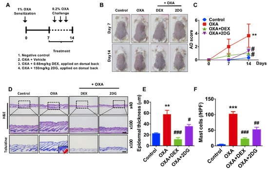 Mice were divided into four groups (n = 3). Negative control was sensitized and challenged with phosphate-buffered saline (PBS). OXA group was treated with oxazolone (4-Ethoxymethylene-2-phenyl-2-oxazolin-5-one; Sigma-Aldrich, St. Louis, MO, USA). For therapeutic groups, 0.68 mg/kg of dexamethasone (DEX) and 150 mg/kg of 2DG were applied on the dorsal back 1 h after OXA challenge. The protocol of OXA-induced model has been described previously in detail, but with some modifications []. Briefly, mice were topically applied on the dorsal skin for sensitization with 100 μL of 1% OXA dissolved in acetone (Merck, Kenilworth, IL, USA) on day 0, and challenged with 0.2% OXA 3 days a week from day 7 to 14. All OXA apply and drug administration was performed under light anesthesia with isoflurane. Mice were photographed by digital single-lens reflex camera (F5.6 1/40, ISO800; Canon, Tokyo, Japan) on days 0, 7, and 14. Dorsal skins were used for staining of H&E and toluidine blue. All experimental procedures were approved by the Institutional Animal Care and Use Committee of the Konkuk University (KU19160).