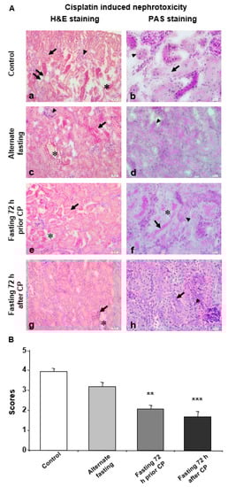 Seventy-two hours of fasting improves the histological parameters for CP induced nephrotoxicity. (A) Microphotographs of H&E and PAS staining. (a,b) Kidney tissue of the control group was shown. (a) Damaged tubules and staining difference (arrow), glomerular degeneration (arrowhead), loss of epithelial cells lining inner part of tubule (double arrow) and small gaps between the tubules (*); and (b) basal membrane degeneration of dysmorphic tubules (arrowhead) and degeneration in epithelial cells lining the inner part of the tubules (arrow) were demonstrated. (c,d) Kidney tissue of the alternate fasting (AF) group was shown. (c) Damaged tubular shape/appearance and staining difference (arrow), glomerular degeneration (arrowhead), ripped off-like gaps between the tubules (*) and (d) degeneration of the basal membrane (arrowhead) were demonstrated. (e,f) Kidney tissue of fasting 72 h prior CP (72P) group was shown. (e) Small damage and widening between the tubules (*) and tubule shape (arrow), decrease in glomerular size and (f) brush border at the apical surface of the epithelial cells lining the inner part of the tubule (arrow) and PAS (+) reaction of basal membranes (arrowhead). No PAS (+) reaction of basal membranes was observed at separated tubules (*) were demonstrated. (g,h) Kidney tissue of fasting 72 h after CP (72A) group was shown. (g) Little misshaped tubules (arrow) and gaps between neighboring tubules (*) and (h) brush border of tubular epithelial cells (arrow) and PAS (+) reaction of basal membranes were demonstrated (arrowhead. a, c, e, g: H&E dye, 200× magnification; b, d, f, h: PAS dye, 400× magnification. (B) Histological score of CP treated mice kidney in control, AF, 72P and 72A groups. Data are given as mean ± S.D. ** p < 0.01, and *** p < 0.001.