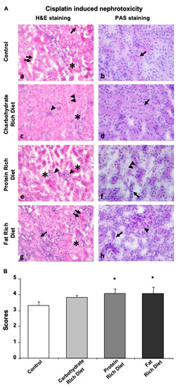 Dietary content determines the extend of CP-induced nephrotoxicity. Tissue of null diet kidney. (A) Microphotographs of H&E and PAS staining. (a,b) Kidney tissue of control group was shown. (a) Damage of tubular shape and loss of epithelial cells lining inner part of tubule (doble arrow), gaps in between the tubules (*) and inflammation (arrow), and (b) intact basal membrane (arrow) were demonstrated. (c,d) Kidney tissue of carbohydrate group was shown. (c) Dysmorphic tubules and cell loss (double arrowhead), hypertrophic glomeruli (arrowhead) and small gaps in intertubular space (*), and (d) basal membrane (arrow) were demonstrated. (e,f) Kidney tissue of protein group was shown. (e) Large separations and destructions in between the tubules (*) and loss of morphology (arrowhead) and (f) microvilli loss at the apical surfaces of the tubules (double arrowhead) and destruction of tubular basal membrane morphology (arrow). (g,h) Kidney tissue of fat group was shown. (g) Morphological disturbances and epithelial cell loss (arrow), gaps (*) and inflammation (double arrow) in between neighboring tubules and (h) basal membrane loss around the tubules (arrow) and glomerular dilatation (arrowhead) were demonstrated. (a,c,e,g) H&E dye, 200× magnification; (b,d,f,h) PAS dye, 400× magnification. (B) Histological score of CP-treated mice kidney in carbohydrate, protein, fat, or null (Control) groups were given. Data are given as mean ± SD. * p < 0.05.