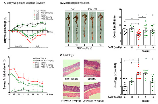 Animals were randomized into control (vehicle), colitis-control (DSS group), and treatment groups (n = 6–17). Colitis was induced with 4% (w/v) DSS in drinking water during two seven-day cycles, separated by ten days of regular water. Two doses of PADF (5 and 10 mg/Kg) were administered intraperitoneally (i.p.) during seven days after DSS withdrawal, while the control group was treated with saline. Body weight and disease activity index (DAI) were monitored exhaustively [12]. Macroscopic parameters, such as colon length and weight/length ratio were also measured after mice sacrifice.
