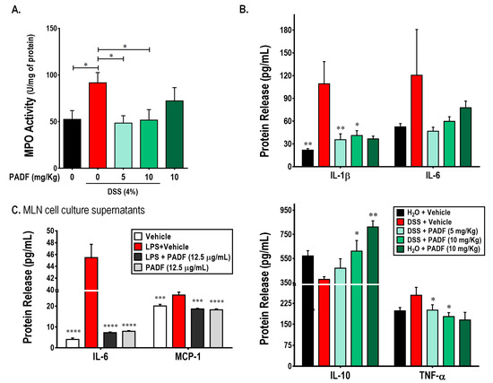 Besides histologic analysis, polymorphonuclear cell infiltration can be indirectly determined by measuring the levels of myeloperoxidase (MPO) in the tissue. As shown on Figure 3A, DSS intake significantly increased the MPO activity in the colon (91.60 ± 11.00 U/mg protein) compared to the control group (52.44 ± 9.38 U/mg protein). In accordance with the observations on the histologic slides, treatment with PADF (10 mg/Kg) was able to significantly reduce the MPO activity by 44% approximately. Similarly, the lower dose of PADF (5 mg/Kg) exerted a significant reduction of MPO activity, confirming indirectly that the test fraction reduced the infiltration of pro-inflammatory cells.