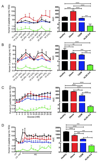 Comparison of dynamic C-peptide secretion profiles (left panels) and areas under the curve (AUCs, right panels) of human PIs derived from different donors and HLSC-ILS. (A) Single pulse of glucose (HG; 28 mM) and potassium (KCl; 50 mM) protocol; (B) two consecutive pulses of glucose (HG; 17 mM); (C) ramp of glucose concentration (3–30 mM); (D) constant high-glucose concentration (HG = 17 mM) protocol. Basal concentration of glucose (LG) for all protocols was 3 mM. Results are presented as mean ± SD of PIs from healthy (n = 3), obese (n = 2), T2DM (n = 3) and HLSC-ILS (n = 3–5). ANOVA with Turkey’s multi-comparison test was performed; * p < 0.05; ** p < 0.01; *** p < 0.001; **** p < 0.0001.