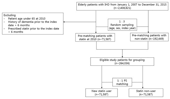 This study was a retrospective cohort study based on medical information gathered from the HIRA claim database. Elderly patients, aged 65 years and older, with a history of IHD, including Angina pectoris and acute/subsequent/chronic myocardial infarction (ICD–10; I20, I21, I22, I23, I24, and I25), from January 1 2007 to December 31 2015, were initially selected for the study cohort. Of these patients, those newly started on statin use in 2010 with a therapy duration of at least 6 consecutive months were included as statin users. We identified statins as seven commonly prescribed statins: atrorvastatin, simvastatin, rosuvastatin, pitavastatin, pravastatin, fluvastatin, and lovastatin. To identify new statin users, we only enrolled statin users with no history of statin treatment before 2010—the index year. A comparison cohort group of statin non-users was selected by random sampling, with adjustment for sex and age. Of the eligible populations selected, statin non-users were then matched at a 1:1 ratio with statin users using propensity score (PS). The index date was defined as the date of the first statin prescription record for statin users, and the first date of the medical record of the index year was defined as the index date for the comparison group—statin non-users. We defined new-onset dementia as a record of the diagnosis of dementia with the ICD–10 code of F00 (dementia in Alzheimer’s disease), F01 (vascular dementia), F02 (dementia in other diseases classified elsewhere), F03 (unspecified dementia), G30 (Alzheimer disease), and G31 (other degenerative diseases of the nervous system). To identify the incidence of new dementia, patients who had dementia diagnosis codes or were prescribed anti-dementia drugs prior to the cohort entry were excluded. Patients who started with two different types of statins at the same time were also excluded. The process of study population selection is shown in Figure 1.