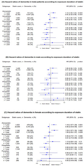 (A) Hazard ratios of dementia risk in total according to statin therapy duration, (B) hazard ratios of dementia risk in males according to statin therapy duration, and (C) hazard ratios of dementia risk in females according to statin therapy duration.