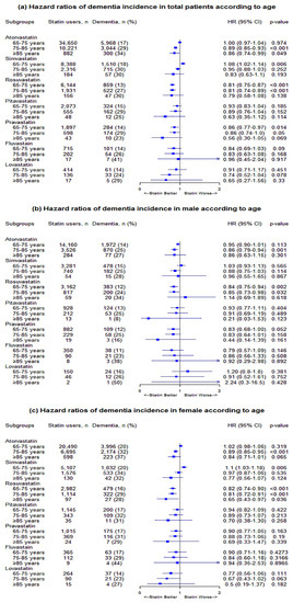 To assess the separate effects of short-term and long-term treatment for a subgroup analysis to minimize bias, patients in each statin group were divided into two subgroups, based on the duration of statin therapy (< 1 year and ≥ 1 year). To assess for age-differential outcomes linked to statin therapy for another subgroup analysis, statin group patients were categorized into three subgroups by patient age at the study entry (65–75 years, 75–85 years, and >85 years). The incidence and risk of new-onset dementia in accordance with statin therapy versus non-therapy were first assessed for all patients and then separately according to patient sex.