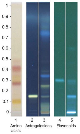 High-performance thin-layer chromatography (HPTLC) plate for amino acids, astragalosides and flavonoids. Track 1: A. mongholicus Bunge HRE (0.2 µL), Track 2: astragaloside IV (2 µL), Track 3: A. mongholicus Bunge HRE (1 µL), Track 4: formononetin (4 µL) and Track 5: A. mongholicus Bunge HRE (3.4 µL).