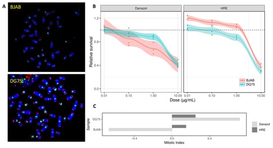 Toxicity of hydroethanolic root extract (HRE) and danazol. BJAB and DG-75 cells were incubated with increasing doses of the HRE or danazol for 3 days. (A) Metaphases from BJAB and DG75 cell lines stained with a Cy3 telomere probe (red) and FITC centromere probe (green) showing drastically short telomeres in BJAB cells. (B) Cell viability determined by manual cell counting after staining with trypan blue. Relative survival was calculated after in vitro exposure to the HRE or danazol. The data are representative of three independent experiments and expressed as the mean ratio ± standard error of the mean. The experiments were performed in triplicate. (C) Mitotic index variation after exposure to HRE and danazol for 3 days following a single dose of 1 µg/mL. Two slides were used for each condition.