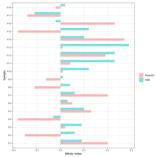 Mitotic index was also evaluated in peripheral blood lymphocytes from 18 healthy donors before and after exposure to 1 µg/mL of HRE or danazol during three days. Figure 3 shows the relative change in the mitotic index after HRE and danazol treatments compared to the control. A higher mitotic index was observed in 15 donors after HRE treatment versus 11 donors after danazol treatment.