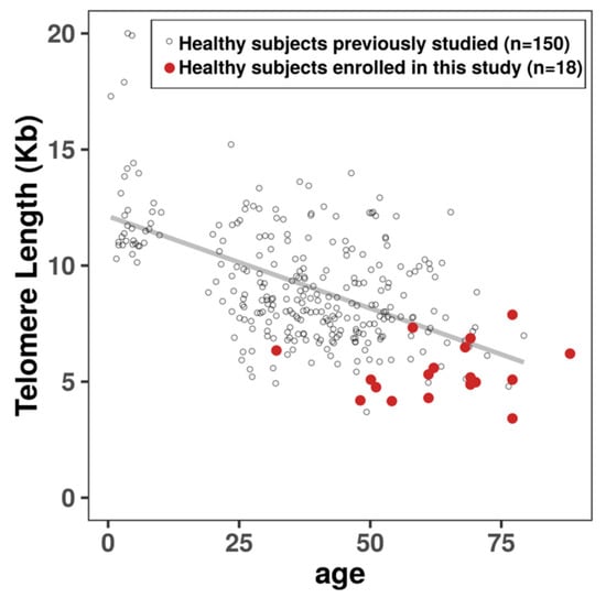 All data were analyzed using R software version 3.5.3 and libraries. Mean comparisons were computed using the two-sample Wilcoxon test. The following convention for symbols indicating statistical significance were used: ns for p > 0.05, * for p ≤ 0.05, ** for p ≤ 0.01, *** for p ≤ 0.001 and **** for p ≤ 0.0001. The regression curve presented was computed on the mean telomere length previously determined in a cohort of 150 healthy donors [34] using a linear regression model (lm).