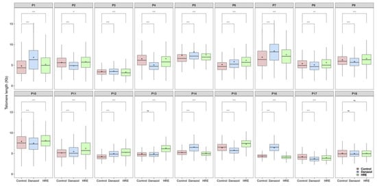Box plots of telomere length in circulating lymphocytes from healthy donors determined by Q-FISH. Mean values are shown by diamond-shaped points. The middle line reflects the median, the box length reflects the interquartile range (interquartile range, 75th–25th percentiles) and the whiskers reflect the 5th and 95th percentiles. Statistical significance of the difference between telomere length of circulating lymphocytes before and after treatment with HRE and danazol (1 µg/mL) (one-way analysis of means ANOVA): **** p < 0.0001. NS: not significant.