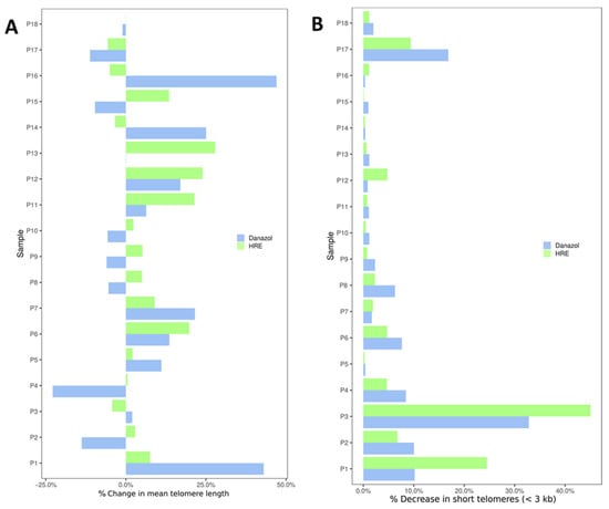Changes in telomere length in circulating lymphocytes from each healthy donor after exposure to HRE and to danazol (1 µg/mL). (A) Change in mean telomere length and (B) decrease in the proportion of lymphocytes showing drastic telomere shortening (<3 kb).