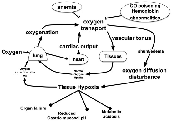 Oxygen (O2) flow in the living body. O2 is carried from the lungs to peripheral organs and tissues by red blood cells through blood vessels. Impaired oxygenation due to lung injury, disorders in transport due to anemia or blood clots and/or disturbance of transition from blood vessels to cells due to interstitial edema result in tissue hypoxia. In addition, O2-related metabolic disturbances due to suppression of O2 utilization, such as drug-induced mitochondrial suppression, might have an effect on the living body, which is equivalent to that of hypoxia.