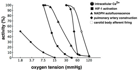 Relationship between oxygen tension and activities of hypoxic responses. Classification based on the partial pressure of O2 that triggers a response is also possible. Hypoxic pulmonary vasospasm reactions begin at a higher oxygen partial pressure compared to HIF-1 activation, and intracellular Ca2+ elevation is mostly observed under anoxic conditions. Such varying hypoxic responses are probably due to differences in the corresponding O2 partial pressure sensing mechanisms [28,31,34,41,42,43,44]. Hypoxia detected via several sensors is triggered as a hypoxic response through various effectors, but crosstalk occurs during the transduction of such signals. For example, some voltage-dependent K+ channel subtypes are regulated by HIF-1. NAPDH: nicotinamide adenine dinucleotide phosphate.