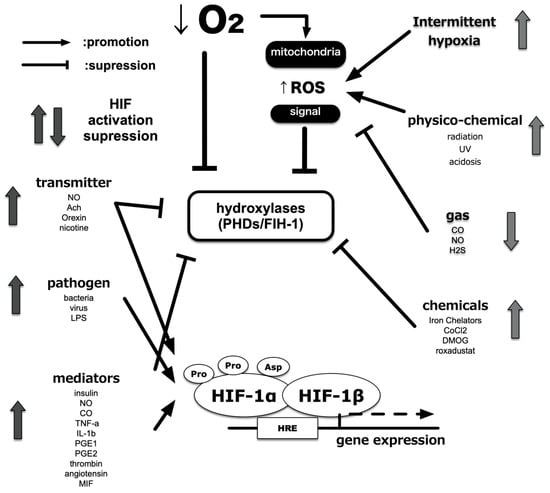 It is reported that deletion and mutations of tumor suppressor genes, such as p53, PTEN, and VHL, confer HIFs activation even under non-hypoxic conditions [123,124,125,126,127]. Receptor stimulation by growth factors, such as HER2, insulin-like growth factor 1, and insulin, induced HIF-1 activation under non-hypoxic conditions [128,129,130]. Muscarinic receptors and nicotinic receptors are also known [131]. Furthermore, there is a report that prostaglandin E1 and E2, which are inflammatory mediators, also activate HIF-1 in an EP receptor-dependent manner [132,133]. PI3K (phosphoinositide 3-kinase) is activated by a signal from the receptor; a signal is transmitted to mTOR (mammalian target of rapamycin) and S6 kinase via Akt, and translation of the HIF-1α protein from mRNA is enhanced [134,135]. As a result, HIF-1α protein accumulates in the cell and activates HIF-1. In parallel with this pathway, translation enhancement via MAPK (mitogen-activated protein kinase) has been reported. Treatment with cigarette smoke extract and smoking resulted in the expression of HIF-1α protein and promoted the expression of pro-inflammatory factors such as VEGF and HO-1 in established cell lines derived from the alveolar epithelium and in vivo mice. Smoking also promotes the expression of the Rtp801 (REDD1) gene and matrix metalloproteinase (MMP), which are attracting attention as molecules that promote alveolar damage and changes in emphysema [136]. This activation requires the production of ROS. In other words, the generated ROS may lead to the activation of HIF-1 regardless of the oxygen partial pressure of the environment.