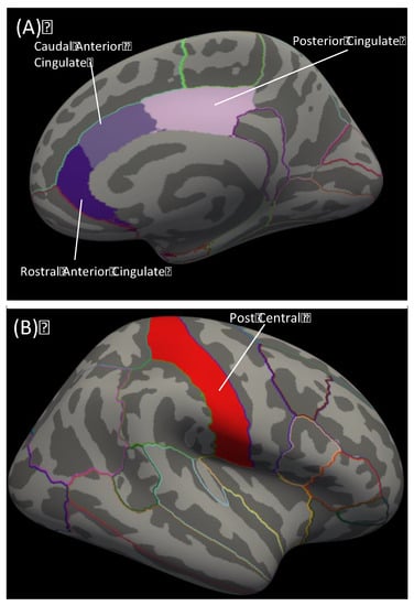 Schematic of FreeSurfer brain regions used in analyses. (A) Right hemisphere cingulate cortex parcellations used in primary analyses. Dark purple = rostral anterior cingulate; medium purple = caudal anterior cingulate; light purple = posterior cingulate. (B) Red = right hemisphere post central parcellation used as the control region analysis.