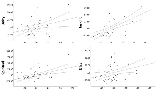 Partial correlation plots controlling for sex, age, and dose between responses to psilocybin (Unity, Bliss, Spiritual, and Insight) and estimates of right hemisphere rostral anterior cingulate cortex (R rACC) thickness with 95% confidence intervals. Scatter plots for non-significant results can be found in Supplementary Materials. Axes represent normalized values. Response to psilocybin is represented as the delta value; psilocybin – placebo.