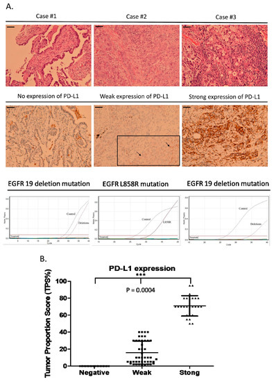Examples of the three groups of patients with different PD-L1 expression levels. (A) Case #1 EGFR exon 19 deletion mutation without PD-L1 expression; case #2 EGFR L858R mutation with weak PD-L1 expression; case #3 EGFR exon 19 deletion with strong PD-L1 expression. (B) Comparison of PD-L1 expression levels among the three groups (mean ± SD %) (0 versus 15.8 ± 13.2 versus 70.9 ± 12, p = 0.0004). The scale bar = 100 µm.