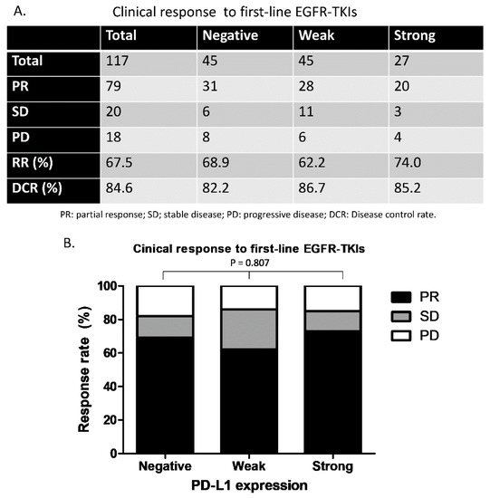 - Su, S.; Dong, Z.-Y.; Xie, Z.; Yan, L.-X.; Li, Y.-F.; Su, J.; Liu, S.-Y.; Yin, K.; Chen, R.-L.; Huang, S.-M.; et al. Strong Programmed Death Ligand 1 Expression Predicts Poor Response and De Novo Resistance to EGFR Tyrosine Kinase Inhibitors Among NSCLC Patients with EGFR Mutation. J. Thorac. Oncol. 2018, 13, 1668–1675. [Google Scholar] [CrossRef]
