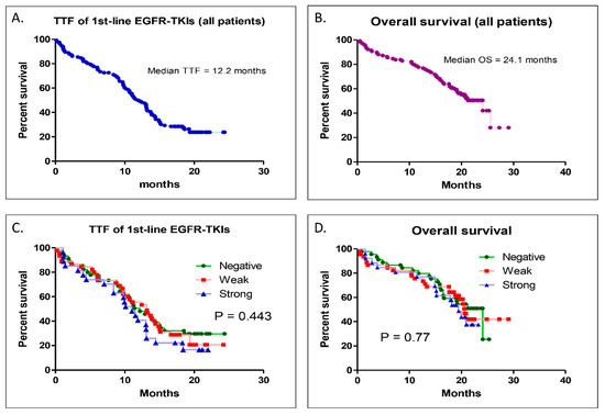 For all the patients of this study, the median TTF of the first-line EGFR-TKIs was 12.2 months, and the median OS was 24.1 months (Figure 4A,B). When the patients were divided into three groups by different PD-L1 expression levels, the median TTFs of the first-line EGFR-TKIs were 12.2, 13.2, and 11 months for the negative, weak, and strong groups, respectively (p = 0.443) (Figure 4C). The median OS rates were 24.1, 20.6, and 19.4 for the negative, weak, and strong groups (p = 0.77) (Figure 4D). There was no statistically significant difference in the TTFs for the first-line EGFR-TKIs or the OS between the three groups.