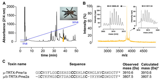 3.1. Isolation of the Novel Spider Venom Peptides μ-TRTX-Pme1a and μ/δ-TRTX-Pme2a from P. metallica