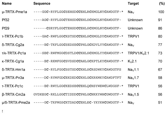 - King, G.F.; Gentz, M.C.; Escoubas, P.; Nicholson, G.M. A rational nomenclature for naming peptide toxins from spiders and other venomous animals. Toxicon 2008, 52, 264–276. [Google Scholar] [CrossRef]