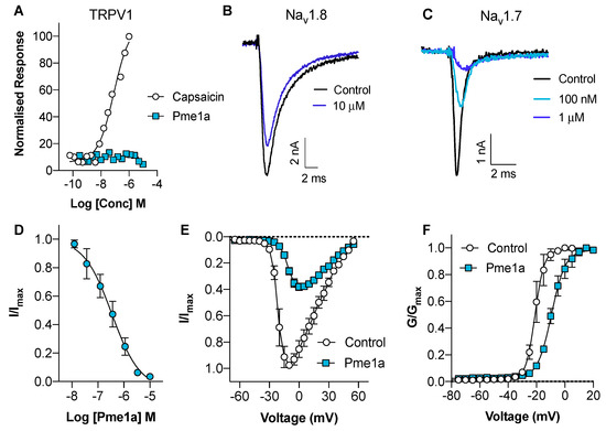 Activity of synthetic Pme1a on TRPV1, NaV1.8 and NaV1.7. (A) Concentration–response curves for capsaicin and Pme1a at rTRPV1 assessed by calcium dye. Data are presented as the mean ± SEM, with n = 3–5 wells per data point. (B) Representative hNaV1.8 current trace before (black) and after addition of Pme1a (blue). Currents were elicited by a 50 ms pulse to +10 mV from a holding potential of −90 mV. (C) Representative hNaV1.7 current trace before (black) and after addition of Pme1a (blue). Currents were elicited by a 50 ms pulse to −20 mV from a holding potential of −90 mV. (D) Concentration–response curve for Pme1a at hNaV1.7 (IC50 334 ± 114 nM). (E) Current-voltage relationship before (white circles) and after addition of 1 μM Pme1a (blue squares). (F) Conductance-voltage curve before (white circles) and after addition of 1 μM Pme1a (blue squares). Pme1a shifted the V1/2 of voltage dependence of activation by +11.6 mV. Data are presented as the mean ± SEM, with n = 3–6 cells per data point.