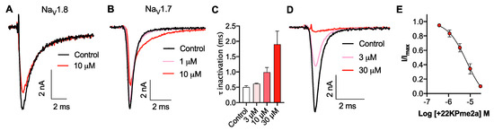 Activity of synthetic Pme2a and [+22K]Pme2a on NaV1.8 and NaV1.7. (A) Representative hNaV1.8 current trace before (black) and after addition of Pme2a (red). Currents were elicited by a 50 ms pulse to +10 mV from a holding potential of −90 mV. (B) Representative hNaV1.7 current trace before (black) and after addition of Pme2a (red). Currents were elicited by a 50 ms pulse to −20 mV from a holding potential of −90 mV. (C) Pme2a concentration-dependently increases the time constant of fast inactivation (τ) at hNaV1.7. (D) Representative hNaV1.7 current trace before (black) and after addition of [+22K]Pme2a (red). Currents were elicited by a 50 ms pulse to −20 mV from a holding potential of −90 mV. (E) Concentration–response curve for [+22K]Pme2a at hNaV1.7 (IC50 5.6 ± 1.1 μM). Data are presented as the mean ± SEM, with n = 4 cells per data point.