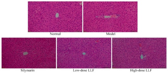 As shown in Table 6, the liver weight and liver index in the model group were the highest among the five groups. Compared with the normal group, the liver weight and liver index in the model group were significantly higher (p < 0.05), indicating successful modeling. The liver weight and liver index in the normal group were the lowest, and the liver weight and liver index in the silymarin group and the LLF groups were reduced to different extents compared with those in the model group. The liver weight and liver index in the high-dose LLF group were closer to those in the silymarin group than the low-dose LLF group, indicating that LLF can effectively ameliorate CCl4-induced liver injury.