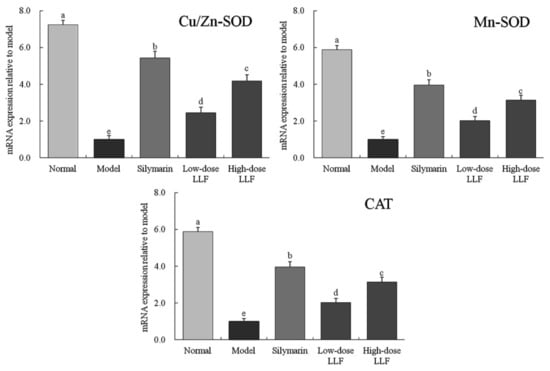 Cu/Zn-SOD, Mn-SOD, and CAT mRNA expression in liver tissues of the mice. Sample data in each group came from a normal distribution. a–e Mean values with different letters in the bar are significantly different (p < 0.05) according to Tukey’s honestly significant different test. Silymarin: mice treated with silymarin (100 mg/kg); low-dose LLF: mice treated with a low concentration of lotus leaf flavonoids (50 mg/kg); high-dose LLF: mice treated with a high concentration of lotus leaf flavonoids (100 mg/kg).