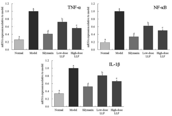TNF-α, NF-κB, and IL-1β mRNA expression in liver tissues of the mice. Sample data in each group came from a normal distribution. a–e Mean values with different letters in the bar are significantly different (p < 0.05) according to Tukey’s honestly significant different test. Silymarin: mice treated with silymarin (100 mg/kg); low-dose LLF: mice treated with a low concentration of lotus leaf flavonoids (50 mg/kg); high-dose LLF: mice treated with a high concentration of lotus leaf flavonoids (100 mg/kg).