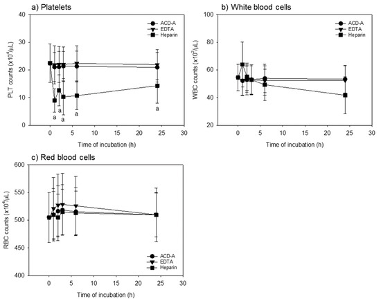 Time-course effects of anticoagulants on platelet and white and red blood cell counts in whole-blood samples. Whole-blood samples were stored following mild mixing at room temperature for up to 24 h. (a) Platelet counts: heparin-anticoagulation treatments significantly (p < 0.05, vs. A-form of acid-citrate-dextrose (ACD-A) and EDTA) reduced platelet counts (vs. other anticoagulation treatments) at the same time points from 1 to 24 h. (b) White blood cell counts: heparin-anticoagulation treatments significantly reduced white blood cell counts only at 24 h (vs. ACD-A-anticoagulation treatments). (c) Red blood cell counts: no significant differences were observed among the groups. n = 15.