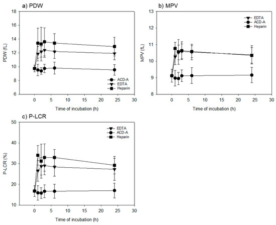 Figure 2 shows the time-course effects of anticoagulants on platelet size (PDW, MPV, and P-LCR) in whole-blood samples. EDTA- and heparin-anticoagulation treatments significantly increased the platelet distribution width when compared to the ACD-A-anticoagulation treatments at the same time points from 1 to 24 h, among all of the parameters studied.
