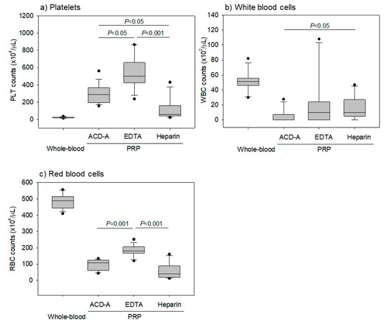 Figure 3 shows the platelet, WBC, and RBC counts in pure PRP preparations. EDTA- anticoagulation treatments yielded the highest counts of platelets. WBCs were not contaminated in all of the pure-PRP samples, and a significant difference in the WBC counts was observed between ACD-A and heparin-anticoagulated samples. Additionally, RBCs were not contaminated; however, EDTA–anticoagulation treatments increased RBC counts the most.