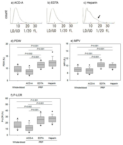 Effects of anticoagulants on platelet size in pure-PRP. Pure-PRP samples were prepared from whole-blood samples stored for 24 h. (a–c) Representative platelet histograms. (d–f) Parameters of platelet size. n = 15. An arrow in panel c represents platelet detected as “large platelet”.