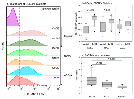 Figure 5 shows the effects of anticoagulants and CaCl2 stimulation on CD62P expression on platelets. The representative histograms of CD62P+ platelets (Figure 5a) reveal that both EDTA- and heparin-anticoagulation treatments increased the CD62P+ platelet count in non-stimulated control platelets. CaCl2 stimulation also increased CD62P+ platelet counts (vs. control) in all of the groups. However, EDTA and heparin seemed to reduce CaCl2 effectiveness (Figure 5b,c). CaCl2 stimulation significantly increased CD41+, CD62P+ platelet counts in ACD-A- and EDTA-anticoagulated samples, but not in heparin-anticoagulated samples. However, the increase was much higher in the ACD-A-anticoagulated samples than in the EDTA-anticoagulated samples. Thus, EDTA and heparin both increased the basal (i.e., control) levels of CD62P+ platelets, but reduced the CaCl2-induced increase in CD62P+ platelet levels.