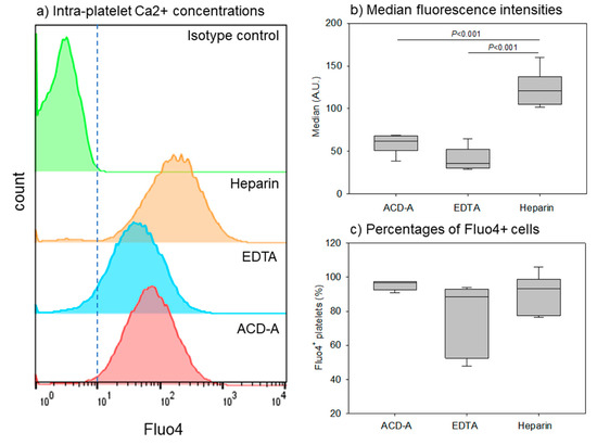 Figure 6 shows the effects of anticoagulants on intra-platelet free Ca2+ concentrations, which is thought to influence platelet activity and functions [32]. The representative histograms of Fluo4+ platelets reveal that the overall fluorescence intensity in EDTA-anticoagulated samples was somewhat lower than that in the ACD-A-anticoagulated samples. Moreover, the fluorescence intensity in the heparin-anticoagulated samples was the highest. The quantification of median values confirmed this order (heparin >> ACD-A > EDTA) (Figure 6b). The Fluo4+ platelet percentage was lower in EDTA- and heparin-anticoagulated samples than that in ACD-A-anticoagulated samples; however, the difference was not significant.