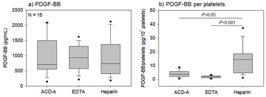 Figure 7 presents the effects of anticoagulants on PDGF-BB concentrations in pure-PRP samples, the values of which were corrected by the dilution factor. No significant difference in the PDGF-BB concentration was observed in various anticoagulated samples (Figure 7a); however, the platelet counts were the highest in EDTA-anticoagulated samples (Figure 3a). Based on these data, PDGF-BB concentration in pure-PRPs were calculated per unit platelet count (107 platelets). PDGF-BB concentrations were the highest in these samples due to apparent low platelet count in heparin-anticoagulated samples, as shown in Figure 7b.