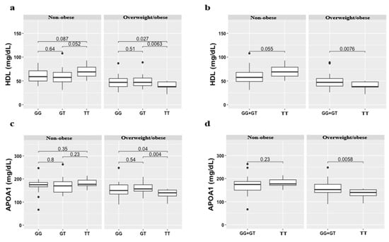 Overall, we observed that the APOA2 rs381362 risk genotype (genotype TT) was associated with low levels of HDL in the overweight/obese individuals. The HDL value of individuals that had the TT genotype was significantly decreased (40.08 mg/dL) as compared with individuals carrying the GG (46.85 mg/dL), GT (48.59 mg/dL), and GG + GT (47.68 mg/dL) genotype (p < 0.05) (Figure 1a,b). However, no significant differences were observed for the HDL value in the non-obese individuals that had the TT genotype as comparing with individuals carrying the GG, GT, and GG + GT genotype (Figure 1a,b and Table 4). Moreover, we also observed that the APOA2 rs381362 risk genotype was associated with low levels of APOA1 in the overweight/obese individuals. The APOA1 levels of individuals that had the TT genotype was significantly decreased (136.58 mg/dL) as compared with individuals carrying the GG (153.19 mg/dL), GT (157.84 mg/dL), and GG + GT (155.43 mg/dL) genotype (p < 0.05) (Figure 1c,d and Table 4). When compared the risk and normal genotypes in non-obese individuals, we did not find significant differences in APOA1 levels (Figure 1c,d, Table 3, and Table 4).